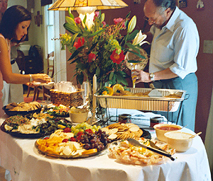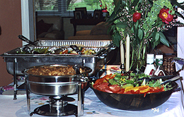In order to keep costs down, I prefer to serve buffet style setup utilizing my own decorative chafing dishes, and high quality paper and/or plastic ware. I generally prepare a center piece and garnish for the buffet table, at the same time utilizing decorative table coverings. Making your buffet table look attractive is always a priority. I believe people also eat with their eyes, so as well as food tasting delicious, it must also look so. I offer menus to suit each and every budget. If you wish me to utilize your own China and Silverware, that would not be a problem, as long as it were for a small gathering. I am available to prepare for anywhere from 2 to 250 people. For intimate or small gatherings of 2 – 30, there would be an additional, reasonable, minimum labor fee included, of which I could discuss with you in further detail if you are interested in such an event. Generally I limit home parties to 75 guests, unless the home is equipped with some sort of commercial kitchen with ample refrigeration and preparation space, as well as a larger oven with extra burners. In function halls with commercial kitchens, or for Clambakes and Barbecues, I can prepare for up to 250 guests, Buffet Style.